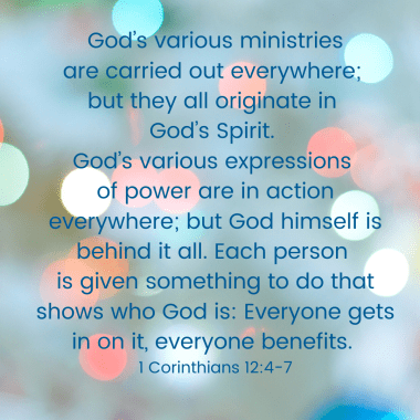 God’s various gifts are handed out everywhere; but they all originate in God’s Spirit. God’s various ministries are carried out everywhere; but they all originate in God’s Spirit. God’s various expressions of power a