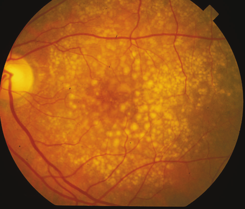 drusen \ ˈdrü-zən \ – small yellowish deposits of cellular debris that accumulate between the retina and the inner layer of the eyeball, that are typically associated with aging, and that may be a sign of age-related macular degeneration